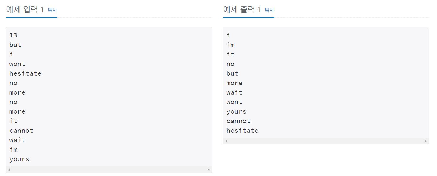 첫째 줄에 단어의 개수 N이 주어진다. (1≤N≤20,000) 둘째 줄부터 N개의 줄에 걸쳐 알파벳 소문자로 이루어진 단어가 한 줄에 하나씩 주어진다. 주어지는 문자열의 길이는 50을 넘지 않는다.