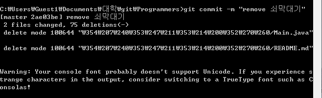 그리고 git commit -m "remove file" 입력으로 변경된 내용을 커밋!!