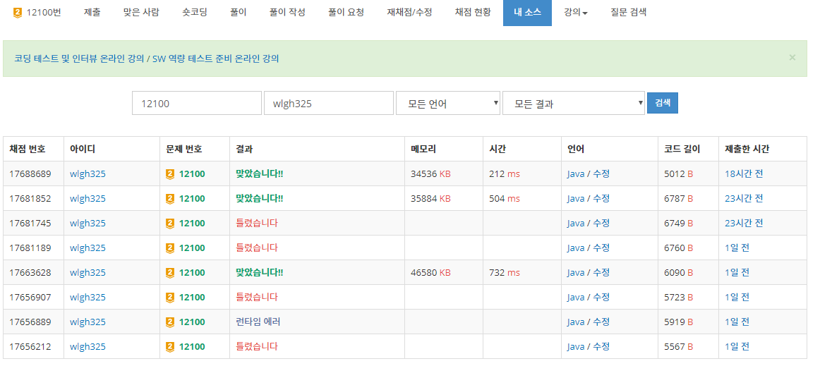 처음 맞은 경우는 1번경우로만 가지치기 한 경우고 두 번째 맞은 경우는 2번 경우도 가지치기 한 경우 세 번째는 arraylist를 이용하지 않고 배열을 이용해서 푼 경우에요. 속도차이가 압도적으로 나네요